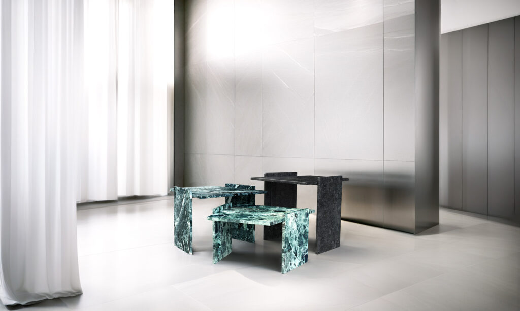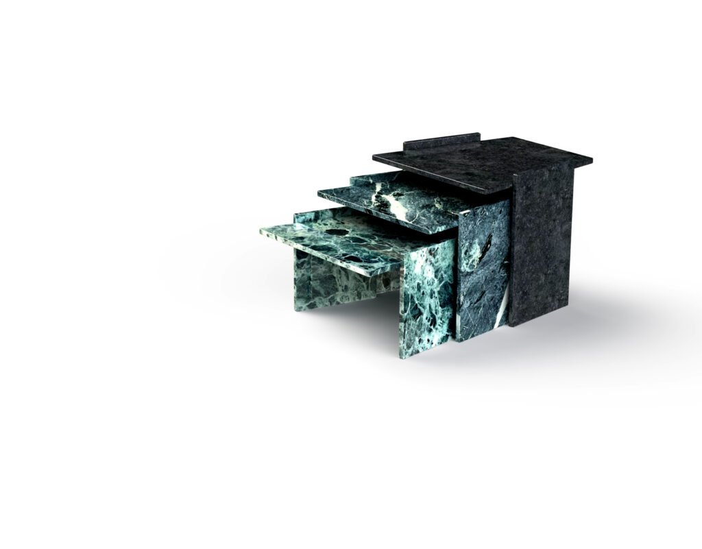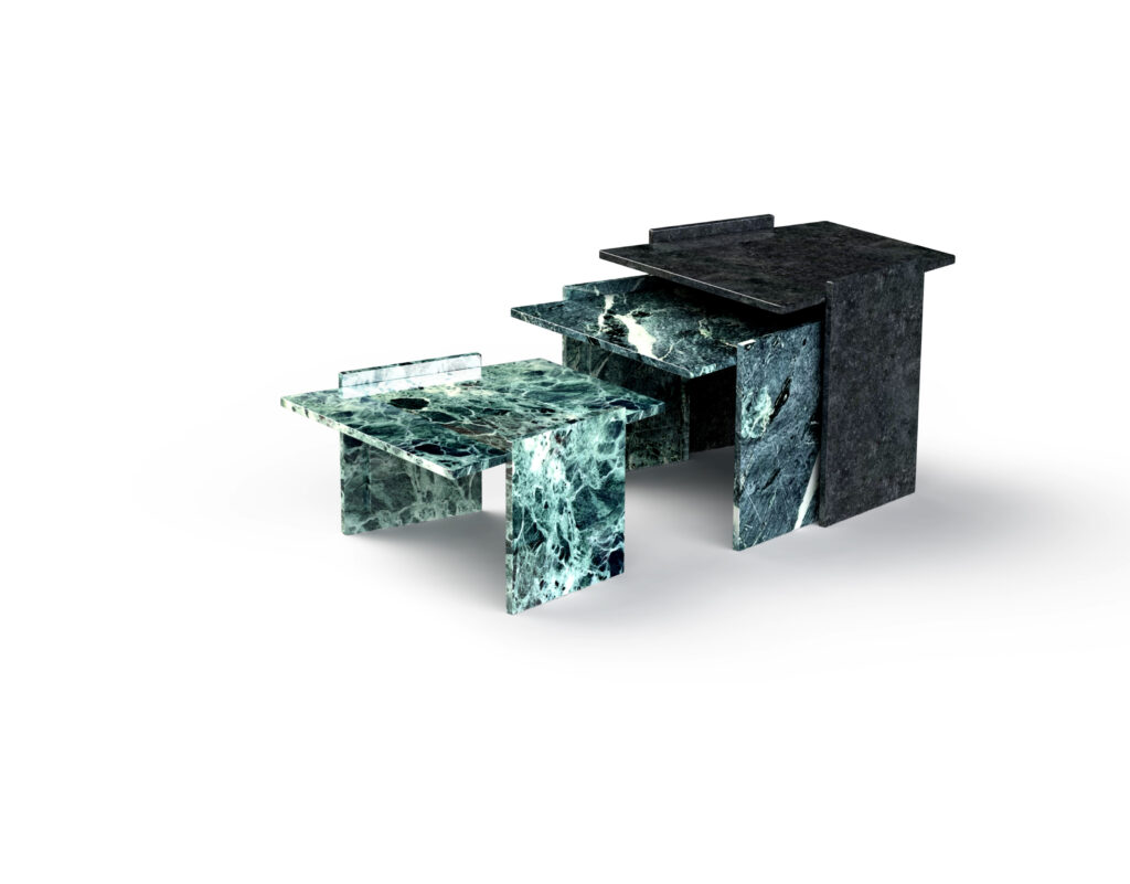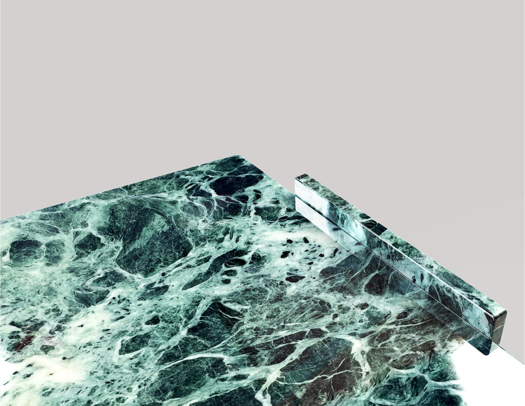 The foundation of this product series largely consists of marble slabs from furniture dating back to the 1950s and 1960s. Loved and used in various households over decades, they bring their own identity and history. Ihab employs a sophisticated and meticulous design process to craft new forms, minimally invasive and transformative yet preserving the essence of the original slabs, without compromising the integrity of the marble. The once mundane marble slabs now radiate with timeless, sleek geometric forms, revitalized and reimagined.