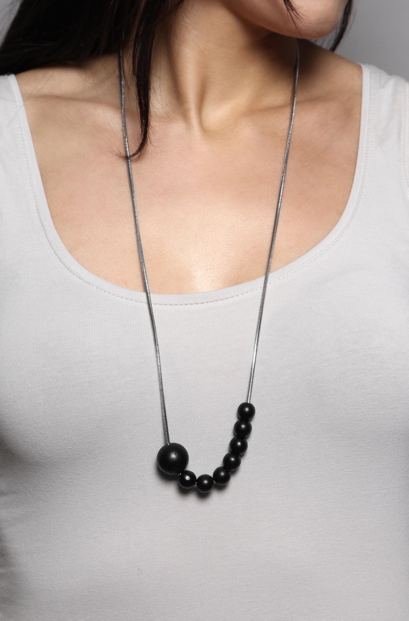 Listening while wearing Lahsa: the individual moments can be selected and activated by embracing one of small beads and moving it toward your ear. A number of seven moments can be stored.
